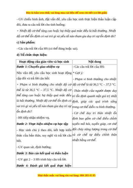 Đây là bản xem th , vu ử i lòng mua tài li u ệ đ xe ể m chi ti t ế (có l i ờ gi i ả ) - GV chi u ế hình nh, ả đ t ặ v n ấ đ , ề yêu c u ầ h c ọ sinh th c ự hi n ệ th o ả lu n ậ c p ặ đôi, đ a ư ra câu trả l i ờ cho tình hu ng: ố + Nhi t ệ đ ộ c ơ thể tăng cao ho c ặ h ạ th p ấ quá m c ứ đ u ề là b t ấ thư ng. ờ Nhi t ệ độ c t ơ h ể ổn đ nh có ị vai trò gì và y u ế t nào t ố ham gia duy trì s ự n đ ổ nh đó? ị c) S n ph ả m ẩ : - Các câu trả l i ờ c a ủ HS (có th đúng ho ể c ặ sai). d) T ch ổ ức thực hi n: ệ Hoạt đ ng c ộ a g ủ iáo viên và h c ọ sinh N i ộ dung Bư c ớ 1: Chuy n gi ể ao nhi m ệ vụ - Các câu tr l ả i ờ c a H ủ S: Nêu v n ấ đ , ề yêu c u ầ h c ọ sinh ho t ạ đ ng ộ * G i ợ ý: c p đôi ặ và trả l i ờ câu h i ỏ : - Ph m ạ vi bình thư ng ờ cho nhi t ệ + Ph m ạ vi bình thư ng ờ cho nhi t ệ độ cơ đ c ộ t
