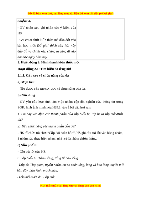 2.1.1. Cấu tạo và ch c năng c ứ a da ủ a) M c t ụ iêu: - Nêu đư c ợ c u t ấ o s ạ ơ lư c và ch ợ c ứ năng c a ủ da. b) N i ộ dung: - GV yêu c u ầ h c ọ sinh làm vi c ệ nhóm c p ặ đôi nghiên c u ứ thông tin trong SGK, hình nh ả minh h a H ọ 39.1 và tr l ả i ờ câu h i ỏ sau: 1. Em hãy xác đ nh ị các thành ph n ầ c a ủ l p ớ bi u ể bì, l p ớ bì và l p ớ mỡ đư i ớ da? 2. Nêu ch c năng các ứ thành ph n c ầ a ủ da? - HS t ổ ch c ứ trò ch i ơ “C p ặ đôi hoàn h o ả ”, HS ghi câu tr ả l i ờ vào b ng ả nhóm, 3 nhóm nào th c ự hi n nhanh ệ nh t ấ sẽ là nhóm chi n t ế h ng. ắ c) S n ph ả m ẩ : - Câu tr l ả i ờ c a H ủ S. 1. L p bi ớ u bì ể : T ng s ầ ng, t ừ ng t ầ bào s ế ống. - L p