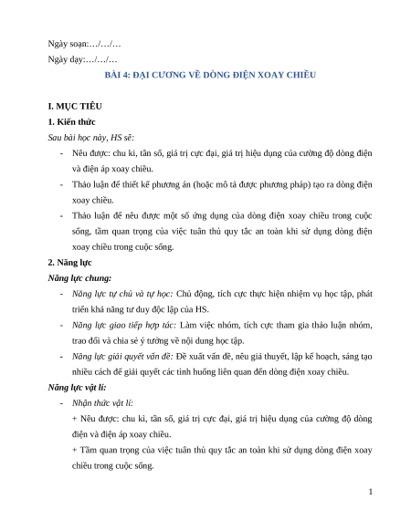 BÀI 4: ĐẠI CƯƠNG VỀ DÒNG ĐIỆN XOAY CHIỀU I. MỤC TIÊU 1. Kiến thức