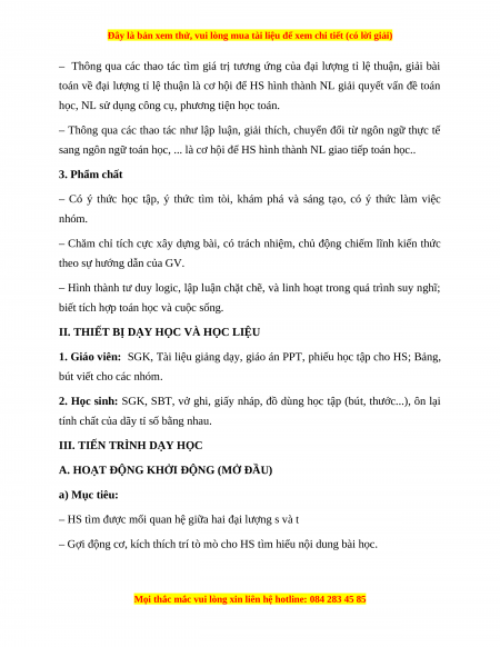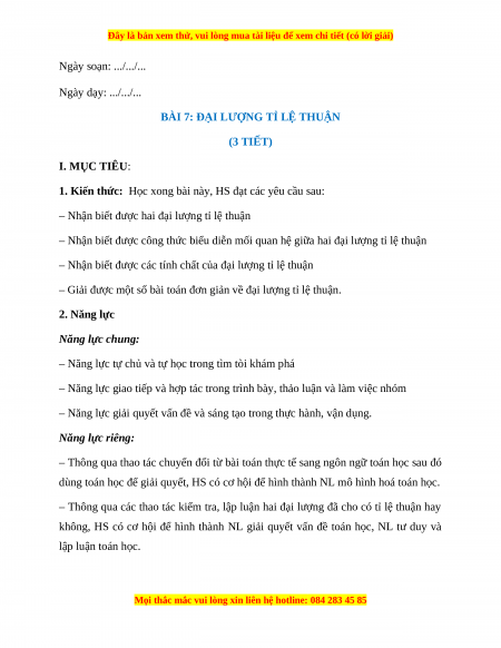 BÀI 7: ĐẠI LƯỢNG TỈ LỆ THUẬN (3 TIẾT) I. MỤC TIÊU: