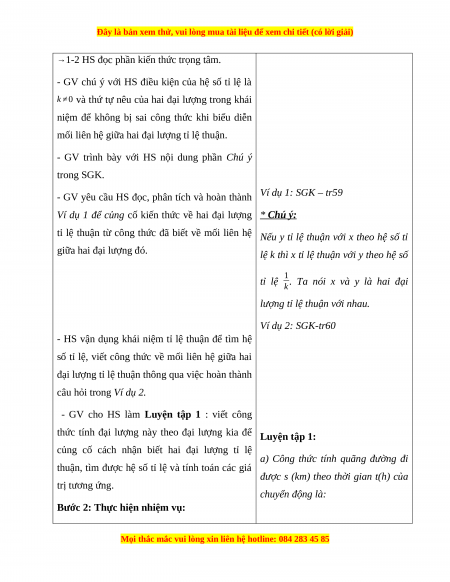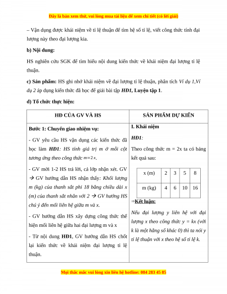 c) Sản phẩm: HS ghi nhớ khái niệm về đại lượng tỉ lệ thuận, phân tích Ví dụ 1,Ví