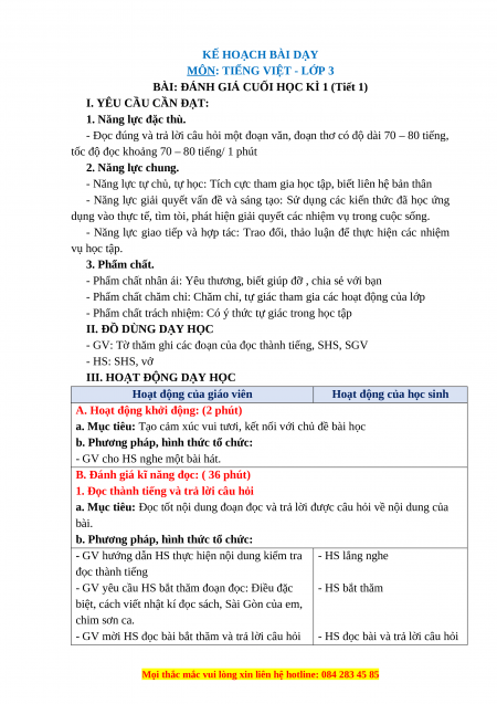Giáo án Đánh giá cuối học kỳ I Tiếng việt 3 Chân trời sáng tạo