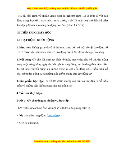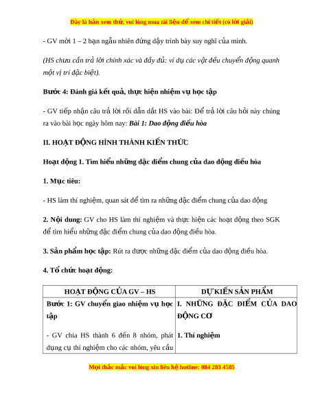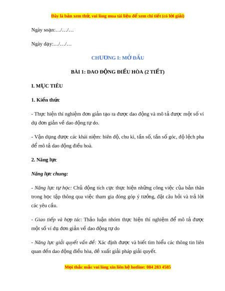 Đây là bản xem th , vu ử i lòng mua tài li u ệ đ xe ể m chi ti t (c ế ó l i ờ gi i ả ) Ngày so n: ạ …/…/… Ngày d y: ạ …/…/… CHƯ N Ơ G I: M Đ Ở ẦU BÀI 1: DAO Đ N Ộ G ĐI U Ề HÒA (2 TI T Ế ) I. M C Ụ TIÊU 1. Ki n t ế h c ứ - Th c ự hi n ệ thí nghi m ệ đ n ơ gi n ả t o ạ ra đư c ợ dao đ ng ộ và mô t ả đư c ợ m t ộ s ố ví d đ ụ n gi ơ n ả v dao đ ề ng t ộ do. ự - V n ậ d ng ụ đư c ợ các khái ni m ệ : biên đ , ộ chu kì, t n ầ s , ố t n ầ s ố góc, đ ộ l ch ệ pha đ m ể ô t dao đ ả ng ộ đi u hoà. ề 2. Năng l c ự Năng l c ự chung: - Năng l c ự tự h c: ọ Chủ đ ng ộ tích c c ự th c ự hi n ệ nh ng ữ công vi c ệ c a ủ b n ả thân trong h c ọ t p ậ thông qua vi c