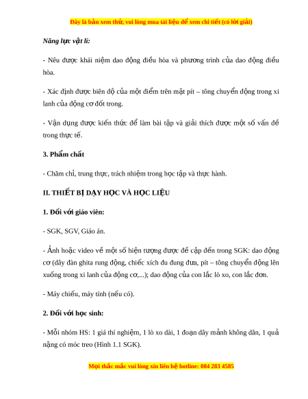 Đây là bản xem th , vu ử i lòng mua tài li u ệ đ xe ể m chi ti t (c ế ó l i ờ gi i ả ) Năng l c ự vật lí: - Nêu đư c ợ khái ni m ệ dao đ ng ộ đi u ề hòa và phư ng ơ trình c a ủ dao đ ng ộ đi u ề hòa. - Xác đ nh ị đư c ợ biên độ c a ủ m t ộ đi m ể trên m t ặ pít – tông chuy n ể đ ng ộ trong xi lanh c a đ ủ ng ộ c đ ơ ốt trong. - V n ậ d ng ụ đư c ợ ki n ế th c ứ để làm bài t p ậ và gi i ả thích đư c ợ m t ộ số v n ấ đề trong th c ự t . ế 3. Ph m ẩ chất - Chăm chỉ, trung th c, ự trách nhi m ệ trong h c t ọ p và ậ th c ự hành.