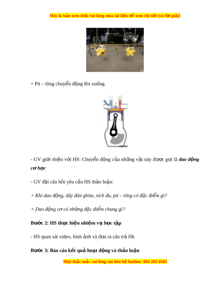ta, xích đu, pit – tông có đ c ặ đi m ể gì? + Dao đ ng ộ c có nh ơ ng đ ữ ặc đi m ể chung gì? Bư c ớ 2: HS th c hi ự n nh ệ i m ệ v h ụ c t ọ p ậ - HS quan sát video, hình nh ả và đ a r ư a câu tr l ả i ờ . Bư c ớ 3: Báo cáo k t ế qu h ả o t ạ đ ng và t ộ h o l ả u n ậ M i