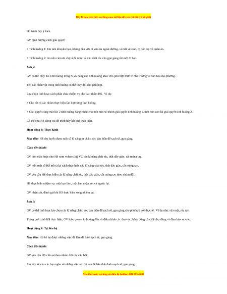 Mục tiêu: HS rèn luyện được một số kì năng tự chăm sóc bản thân để sạch sẽ, gọn gàng.