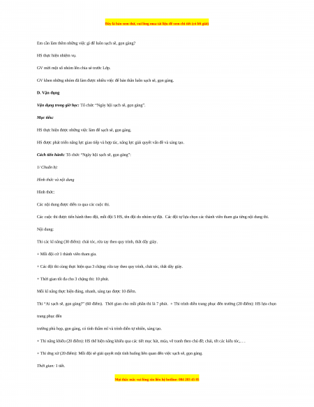 Thi “Ai sạch sẽ, gọn gàng?” (60 điểm). Thời gian cho mỗi phần thi là 7 phút. + Thi trình diễn trang phục đến trường (20 điểm): HS lựa chọn
