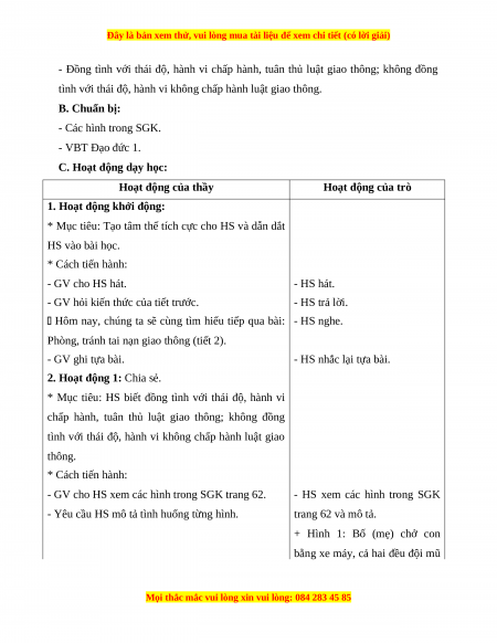 tình với thái độ, hành vi không chấp hành luật giao thông. B. Chuẩn bị: - Các hình trong SGK. - VBT Đạo đức 1.