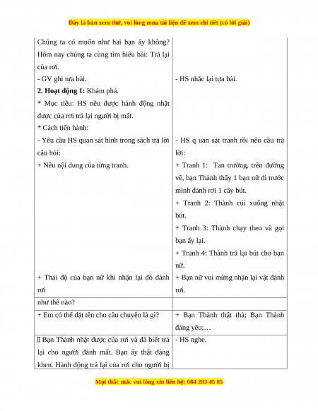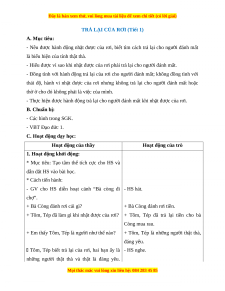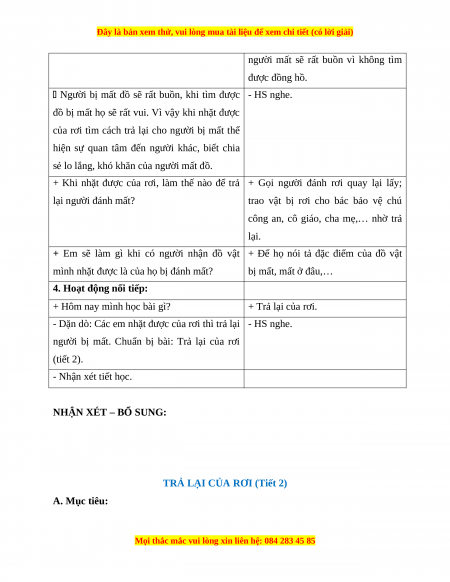 TRẢ LẠI CỦA RƠI (Tiết 1) A. Mục tiêu: