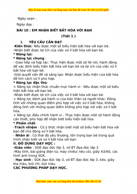 BÀI 10 : EM NHẬN BIẾT BẤT HÒA VỚI BẠN (Tiết 1 ) I. YÊU CẦU CẦN ĐẠT