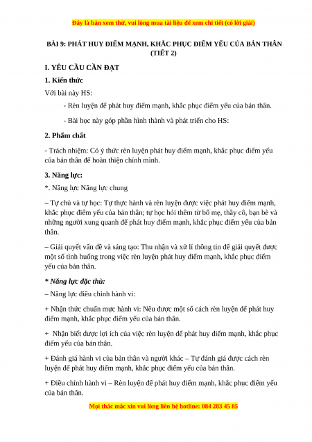 BÀI 9: PHÁT HUY ĐIỂM MẠNH, KHẮC PHỤC ĐIỂM YẾU CỦA BẢN THÂN (TIẾT 2)