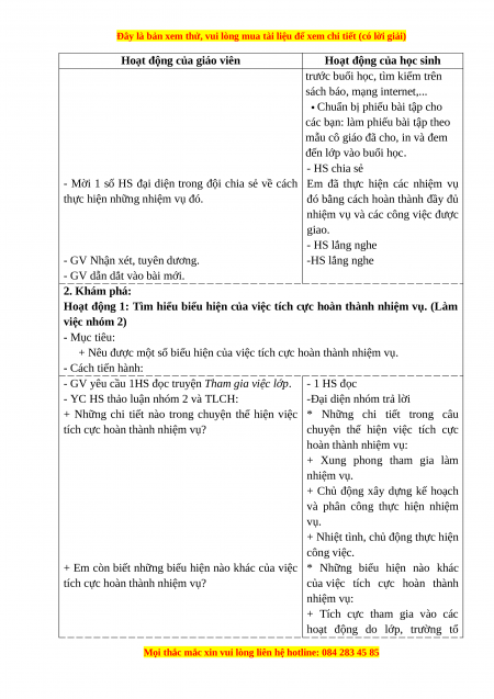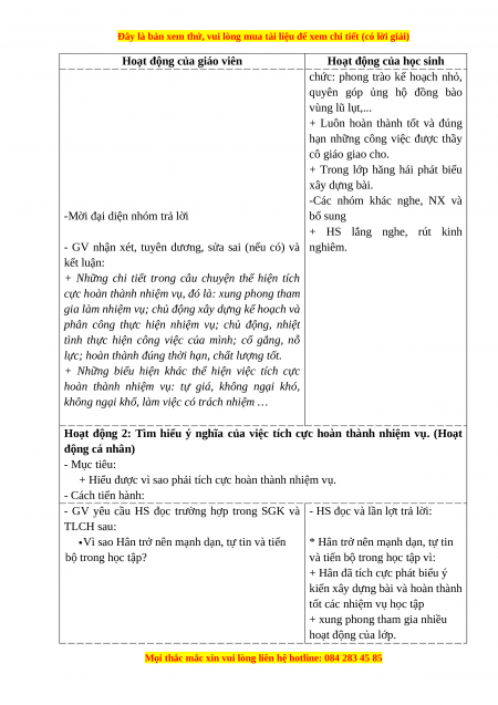 Hoạt động 1: Tìm hiểu biểu hiện của việc tích cực hoàn thành nhiệm vụ. (Làm việc nhóm 2) - Mục tiêu:
