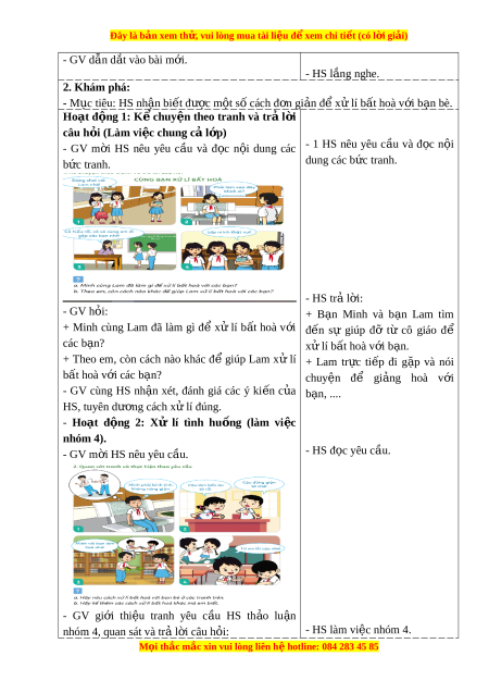 Đây là bản xem th , vu ử i lòng mua tài li u ệ đ xe ể m chi ti t (c ế ó l i ờ gi i ả ) - GV d n d ẫ t ắ vào bài m i ớ . - HS l ng ắ nghe. 2. Khám phá: - M c ụ tiêu: HS nh n bi ậ t ế đư c ợ m t ộ s cách ố đ n gi ơ n đ ả x ể ử lí b t ấ hoà v i ớ b n ạ bè. Hoạt đ ng ộ 1: K ể chuy n ệ theo tranh và tr ả l i ờ câu h i ỏ (Làm vi c chung c ệ l ả p) ớ - GV m i ờ HS nêu yêu c u ầ và đ c ọ n i