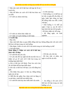 ặ hù: Sau bài h c, h ọ c ọ sinh s : ẽ - Th c hi ự n đ ệ ư c ợ m t ộ s cách đ ố n ơ gi n, ả phù h p đ ợ x ể l ử í b t ấ hoà v i ớ b n ạ bè. - S n s ẵ àng giúp b n bè x ạ ử lí b t ấ hoà v i ớ nhau. 2. Năng l c chung. ự - Năng l c ự tự ch , ủ tự h c: ọ Bi t ế quan sát và nh n ậ bi t ế đư c ợ các b t ấ hoà trong quan hệ v i ớ b n ạ bè. - Năng l c gi ự i ả quy t ế v n đ ấ và s ề áng t o: ạ Có kh năng t ả đ ự a r ư a cách x l ử í b t ấ hoà đ n ơ gi n v ả i ớ b n ạ bè. - Năng l c ự giao ti p ế và h p ợ tác: Bi t ế chia s , ẻ trao đ i ổ , trình bày trong ho t ạ đ ng ộ nhóm. 3. Phẩm ch t ấ . - Ph m ẩ ch t ấ nhân ái: Có ý th c ứ giúp đỡ l n ẫ nhau trong ho t ạ đ ng ộ nhóm để hoàn thành nhi m ệ v . ụ - Ph m ẩ ch t ấ trung th c: ự Chăm ch quan s ỉ át, suy nghĩ, tr l ả i ờ câu h i ỏ . - Ph m ẩ ch t ấ trách nhi m ệ : Gi t ữ r t ậ t , bi ự t ế l ng nghe, h ắ c ọ t p nghi ậ êm túc. II.Đ D Ồ ÙNG D Y Ạ H C Ọ - K ho ế ch ạ bài d y ạ , bài gi ng ả Power point. - SGK và các thi t ế b , h ị c ọ li u ph ệ v ụ cho t ụ i t ế d y ạ . III. HOẠT Đ N Ộ G D Y Ạ H C Ọ Hoạt đ ng c ộ a gi ủ áo viên Hoạt đ ng c ộ a h ủ c s ọ inh 1. Kh i ở đ ng: ộ - M c ụ tiêu: T o không khí ạ vui v , kh ẻ n kh ấ i ở trư c ớ gi h ờ c. ọ - Cách ti n ế hành: - GV yêu c u ầ HS hát k t ế h p ợ v n ậ đ ng ộ theo - HS hát k t ế h p ợ v n ậ đ ng ộ nh c ạ bài hát “L p ớ chúng ta đoàn k t ế ” c a ủ nh c ạ theo nh c. ạ sĩ M ng L ộ ân. - GV h i ỏ : - HS tr l ả i ờ :