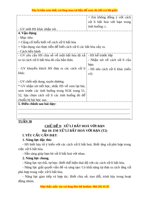 Ủ Ề 9: XỬ LÍ BẤT HOÀ V I Ớ BẠN Bài 10: EM X L Ử Í B T Ấ HOÀ V I Ớ B N Ạ (T2) I. YÊU CẦU CẦN ĐẠT: 1. Năng l c đ ự c t ặ hù: - HS bi t ế bày tỏ ý ki n ế v i ớ các cách xử lí b t ấ hoà. Bi t ế ng ứ x ử phù h p ợ trong việc x l ử í b t ấ hòa. - S n s ẵ àng giúp b n bè x ạ ử lí b t ấ hoà v i ớ nhau. 2. Năng l c chung. ự - Năng l c t ự ch ự , ủ t h ự c: ọ Bi t ế th hi ể n t ệ hái đ v ộ i ớ các cách x l ử í b t ấ hòa. - Năng l c ự gi i ả quy t ế v n ấ đ ề và sáng t o: ạ Có kh ả năng t ự đ a ư ra cách ng ứ xử phù h p ợ trong vi c x ệ l ử í b t ấ hòa. - Năng l c ự giao ti p ế và h p ợ tác: Bi t ế chia s , ẻ trao đ i ổ , trình bày trong ho t ạ đ ng ộ nhóm. M i