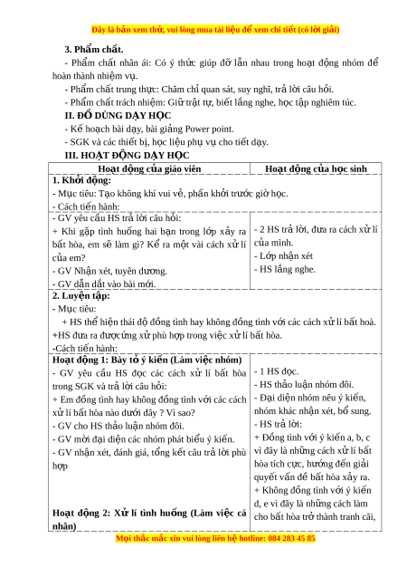 Đây là bản xem th , vu ử i lòng mua tài li u ệ đ xe ể m chi ti t (c ế ó l i ờ gi i ả ) + Em không đ ng ồ ý v i ớ cách xử lí b t ấ hoà v i ớ b n ạ trong tình huống: c. - GV m i ờ HS khác nh n xét ậ . 4. V n d ậ ng ụ - M c ụ tiêu: + C ng ủ c hi ố u bi ể t ế v cách x ề ử lí b t ấ hòa + V n d ậ ng vào ụ th c t ự i n đ ễ bi ể t ế cách x l ử í các b t ấ hòa x y r ả a. - Cách ti n ế hành - GV yêu c u ầ HS chia sẻ về m t ộ b t ấ hòa đã xả - HS k t ể rư c ớ l p ớ ra và cách x l ử í b t ấ hòa đó c a b ủ n ả thân. - Nh n