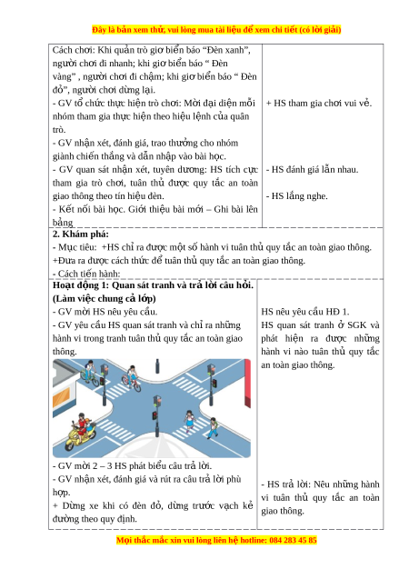 giao thông theo tín hi u đèn. ệ - HS l ng ắ nghe. - K t ế n i ố bài h c. ọ Gi i ớ thi u ệ bài m i ớ – Ghi bài lên b ng ả 2. Khám phá: - M c ụ tiêu: +HS ch r ỉ a đư c ợ m t ộ s hành vi ố tuân th quy t ủ c an t ắ oàn giao thông. +Đ a ư ra đư c ợ cách th c ứ đ t ể uân th quy t ủ c ắ an toàn giao thông. - Cách ti n ế hành: Hoạt đ ng ộ