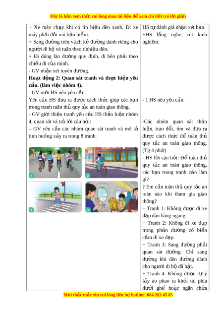 ầ các nhóm quan sát tranh và mô tả lu n, ậ trao đ i ổ , tìm và đ a ư ra tình huống x y r ả a trong 8 tranh. đư c ợ cách th c ứ để tuân thủ quy t c ắ an toàn giao thông. (Tg 4 phút) - HS l i ờ câu h i ỏ : Để tuân thủ quy t c ắ an toàn giao thông, các b n ạ trong tranh c n ầ làm gì? ? Em c n ầ tuân thủ quy t c ắ an toàn nào khi tham gia giao thông? + Tranh 1: Không đư c ợ đi xe đ p dàn hàng ạ ngang. + Tranh 2: Không đi xe đ p ạ trong ph n ầ đư ng ờ có bi n ể cấm đi xe đ p. ạ + Tranh 3: Sang đư ng ờ ph i ả quan sát đư ng. ờ Chỉ sang đư ng ờ khi đèn đư ng ờ dành cho ngư i ờ đi b đã ộ b t ậ . + Tranh 4: Không đư c ợ tự ý lấy áo phao ra kh i ỏ túi phía dư i ớ ghế ho c ặ ngăn ch a ứ M i