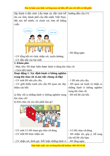 Đây là bản xem th , vu ử i lòng mua tài li u ệ đ xe ể m chi ti t (c ế ó l i ờ gi i ả ) l p ớ thành 4 đ i ộ ch i ơ : L n ầ lư t ợ các đ i ộ ch i ơ kể hư ng ớ d n c ẫ a ủ GV. tên các t nh, ỉ thành phố c a ủ đ t ấ nư c ớ Vi t ệ Nam, đ i ộ nào kể nhi u ề và chính xác h n ơ sẽ th ng ắ cu c. ộ - HS l ng nghe. ắ - GV tổng k t ế trò ch i ơ , nh n ậ xét, tuyên dư ng. ơ - GV d n d ẫ t ắ vào bài m i ớ . 2. Khám phá: - M c ụ tiêu: HS th c hi ự n đ ệ ư c hành vi ợ đúng khi chào c . ờ - Cách ti n ế hành: Hoạt đ ng ộ 1: Xác đ nh