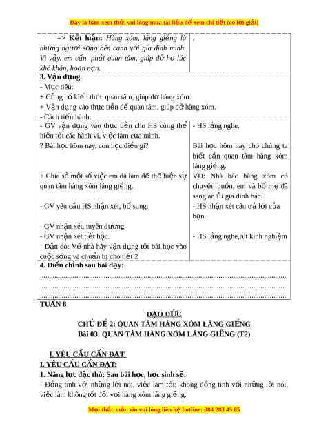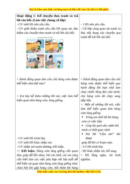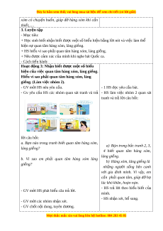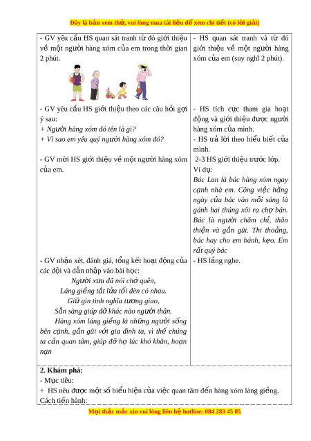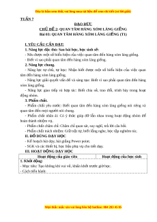 ặ hù: Sau bài h c, h ọ c ọ sinh s : ẽ - Nêu đư c ợ m t ộ số bi u hi ể n c ệ a vi ủ c quan t ệ âm đ n ế hàng xóm láng gi ng. ề - Bi t ế vì sao ph i ả quan tâm đ n ế hàng xóm láng gi ng. ề 2. Năng l c chung. ự - Năng l c ự tự ch , ủ tự h c: ọ Nh n ậ bi t ế đư c ợ m t ộ số bi u ể hi n ệ c a ủ vi c ệ quan tâm đ n hàng ế xóm láng gi ng. ề - Năng l c ự gi i ả quy t ế v n ấ đ ề và sáng t o: ạ Bi t ế vì sao ph i ả quan tâm đ n ế hàng xóm láng gi ng. ề - Năng l c ự giao ti p ế và h p ợ tác: Bi t ế chia s , ẻ trao đ i ổ , trình bày trong ho t ạ đ ng ộ nhóm. 3. Phẩm ch t ấ . - Ph m ẩ ch t ấ yêu nư c: ớ Bi t ế quan tâm đ n ế hàng xóm láng gi ng ề nói riêng và quan tâm đ n ế m i ọ ngư i ờ nói chung. - Ph m ẩ ch t ấ nhân ái: Có ý th c ứ giúp đỡ l n ẫ nhau trong ho t ạ đ ng ộ nhóm để hoàn thành nhi m ệ v . ụ - Ph m ẩ ch t ấ chăm ch : ỉ Chăm ch quan s ỉ át, suy nghĩ, tr l ả i ờ câu h i ỏ . - Ph m ẩ ch t ấ trách nhi m ệ : Gi t ữ r t ậ t , bi ự t ế l ng nghe, h ắ c ọ t p nghi ậ êm túc. II. Đ D Ồ ÙNG D Y Ạ H C Ọ - K ho ế ch ạ bài d y ạ , bài gi ng ả Power point. - SGK và các thi t ế b , h ị c ọ li u ph ệ v ụ cho t ụ i t ế d y ạ . III. HOẠT Đ N Ộ G D Y Ạ H C Ọ Hoạt đ ng c ộ a g ủ iáo viên Hoạt đ ng c ộ a h ủ c s ọ inh 1. Kh i ở đ ng: ộ - M c ụ tiêu: T o không khí ạ vui v , kh ẻ n kh ấ i ở trư c ớ gi h ờ c. ọ - Cách ti n ế hành: M i