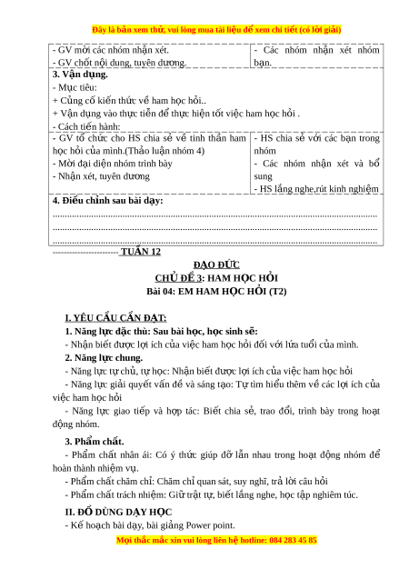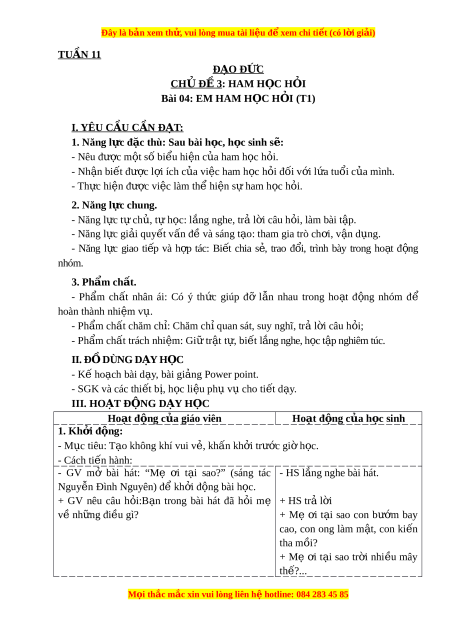 Đây là bản xem th , vu ử i lòng mua tài li u ệ đ xe ể m chi ti t (c ế ó l i ờ gi i ả ) TUẦN 11 ĐẠO Đ C Ứ CH Đ Ủ Ề 3: HAM H C Ọ H I Ỏ Bài 04: EM HAM H C Ọ H I Ỏ (T1) I. YÊU CẦU CẦN ĐẠT: 1. Năng l c đ ự c t