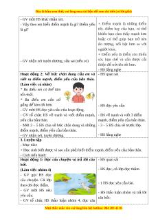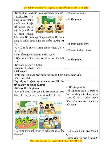 Đây là bản xem th , vu ử i lòng mua tài li u ệ đ xe ể m chi ti t (c ế ó l i ờ gi i ả ) - GV tổ ch c ứ trò ch i ơ “Đoán ngư i ờ b n ạ bí m t ậ ”. - HS quan sát tranh. - Cách ch i ơ : GV miêu tả về nh ng ữ - HS l ng nghe. ắ ngư i ờ b n ạ bí m t ậ . Mỗi ngư i ờ b n ạ bí m t ậ đư c ợ miêu tả về đi m ể m nh, ạ đi m ể y u. ế HS đoán ngư i ờ b n ạ đó là ai. HS đoán đúng sẽ nh n ậ đư c ợ ngôi sao đi m ể thư ng ở từ GV. - HS tham gia trò ch i ơ . - GV tổ ch c ứ cho HS tham gia trò ch i ơ . G i ợ ý câu h i ỏ : - HS đoán tên b n ạ bí m t ậ + B n n ạ có gi ữ ng ọ hát hay nh ng r ư t ụ rè. + B n ạ nam cá tính, h c ọ t t ố và có mái tóc h i ơ - HS l ng nghe. ắ xoăn. - GV nh n xét ậ , tuyên dư ng. ơ - GV d n d ẫ t ắ vào bài m i ớ . 2. Khám phá: - M c ụ tiêu: HS nh n bi ậ t ế đư c ợ th nào l ế à đi m ể m nh, ạ đi m ể y u. ế - Cách ti n ế hành: Hoạt đ ng