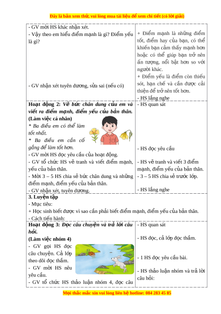 Đây là bản xem th , vu ử i lòng mua tài li u ệ đ xe ể m chi ti t (c ế ó l i ờ gi i ả ) - GV m i ờ HS khác nh n xét ậ . - V y ậ theo em hi u ể đi m ể m nh ạ là gì? Đi m ể y u ế + Đi m ể m nh ạ là nh ng ữ đi m ể là gì? tốt, đi m ể hay c a ủ b n, ạ có thể khi n ế b n ạ c m ả th y ấ m nh ạ h n ơ ho c ặ có thể giúp b n ạ trở nên ấn tư ng, ợ nổi b t ậ h n ơ so v i ớ ngư i ờ khác. + Đi m ể y u ế là đi m ể còn thi u ế - GV nh n xét ậ tuyên dư ng, ơ s a s ử ai (n u có) ế sót, h n ạ chế và c n ầ đư c ợ c i ả thi n đ ệ t ể r nên t ở ốt h n. ơ - HS l ng nghe ắ Hoạt đ ng