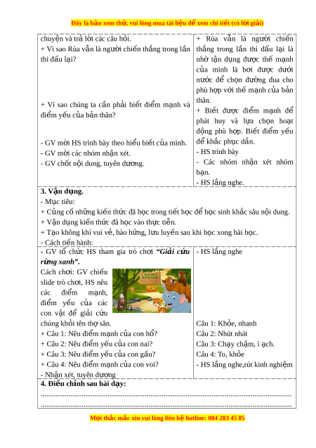 ờ HS trình bày theo hi u bi ể t ế c a ủ mình. đ kh ể ắc ph c d ụ ần. - GV m i ờ các nhóm nh n ậ xét. - HS trình bày - GV chốt n i ộ dung, tuyên dư ng. ơ - Các nhóm nh n ậ xét nhóm b n. ạ - HS l ng nghe. ắ 3. V n d ậ ng. ụ - M c ụ tiêu: + C ng ủ c nh ố ng ki ữ n t ế h c đã h ứ c ọ trong ti t ế h c ọ đ h ể c s ọ inh kh c s ắ âu n i ộ dung. + V n d ậ ng ki ụ n ế th c ứ đã h c vào ọ th c ự ti n. ễ + T o không khí ạ vui v , hào ẻ h ng, l ứ u l ư uy n s ế au khi h c ọ xong bài h c. ọ - Cách ti n ế hành: - GV tổ ch c ứ HS tham gia trò ch i ơ “Giải c u ứ - HS l ng nghe ắ rừng xanh”. Cách ch i ơ : GV chi u ế slide trò ch i ơ , HS nêu các đi m ể m nh, ạ đi m ể y u ế c a ủ các con v t ậ để gi i ả c u ứ chúng kh i ỏ tên th s ợ ăn. Câu 1: Kh e, nhanh ỏ + Câu 1: Nêu đi m ể m nh c ạ a ủ con h ? ổ Câu 2: Nhút nhát + Câu 2: Nêu đi m ể y u c ế a ủ con nai? Câu 3: Ch y ạ ch m ậ , ì ch. ạ + Câu 3: Nêu đi m ể y u c ế a ủ con g u? ấ Câu 4: To, kh e ỏ + Câu 4: Nêu đi m ể m nh c ạ a ủ con voi? - HS l ng nghe,r ắ út kinh nghi m ệ - Nh n xét ậ , tuyên dư ng ơ 4. Đi u ch ề nh s ỉ au bài d y ạ :