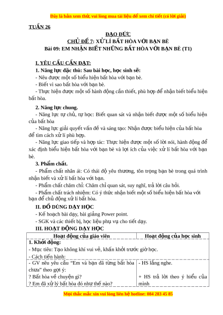 Đây là bản xem th , vu ử i lòng mua tài li u ệ đ xe ể m chi ti t (c ế ó l i ờ gi i ả ) TUẦN 26 ĐẠO Đ C Ứ CH Đ Ủ Ề 7: X L Ử Í BẤT HÒA V I Ớ B N Ạ BÈ Bài 09: EM NHẬN BI T Ế NH N Ữ G B T Ấ HÒA V I Ớ B N Ạ BÈ (T1) I. YÊU CẦU CẦN ĐẠT: 1. Năng l c đ ự c t