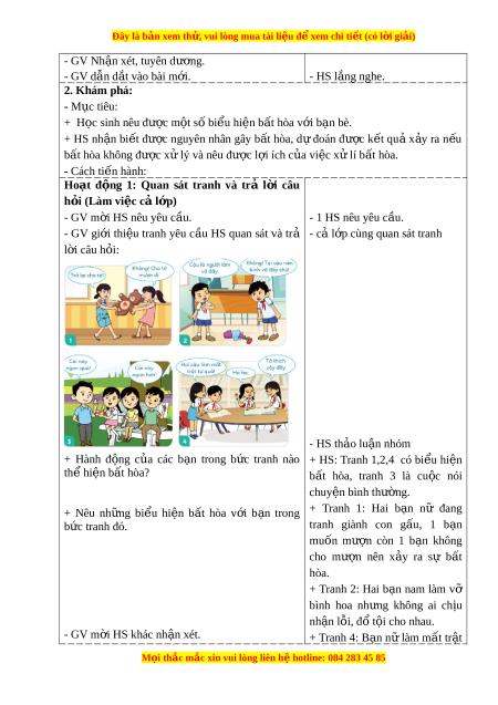 Đây là bản xem th , vu ử i lòng mua tài li u ệ đ xe ể m chi ti t (c ế ó l i ờ gi i ả ) - GV Nh n xét ậ , tuyên dư ng. ơ - GV d n d ẫ t ắ vào bài m i ớ . - HS l ng nghe. ắ 2. Khám phá: - M c ụ tiêu: + H c ọ sinh nêu đư c ợ m t ộ s bi ố u hi ể n b ệ t ấ hòa v i ớ b n ạ bè. + HS nh n ậ bi t ế đư c ợ nguyên nhân gây b t ấ hòa, d ự đoán đư c ợ k t ế qu ả x y ả ra n u ế bất hòa không đư c ợ x l ử ý và nêu đư c ợ l i ợ ích c a vi ủ c x ệ l ử í b t ấ hòa. - Cách ti n ế hành: Hoạt đ ng