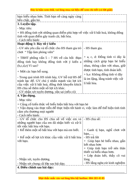 Đây là bản xem th , vu ử i lòng mua tài li u ệ đ xe ể m chi ti t (c ế ó l i ờ gi i ả ) b n ạ hi u ể nhau h n. ơ Tình b n ạ sẽ càng ngày càng b n ch ề t ặ , g n ắ bó. 3. Luy n t ệ p. ậ - M c ụ tiêu: + HS đ ng t ồ ình v i ớ nh ng quan đi ữ m ể phù h p v ợ ề vi c x ệ l ử í b t ấ hoà, không đ ng ồ tình v i ớ quan đi m ể gây tranh cãi, b t ấ hòa. - Cách ti n ế hành: Hoạt đ ng 1 ộ : Bày t ý k ỏ i n ế - GV nêu yêu c u và ầ tổ ch c