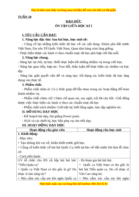 Đây là bản xem th , vu ử i lòng mua tài li u ệ đ xe ể m chi ti t (c ế ó l i ờ gi i ả ) TUẦN 10 ĐẠO Đ C Ứ ÔN TẬP GIỮA H C Ọ KÌ I I. YÊU CẦU CẦN ĐẠT: 1. Năng l c đ ự c t