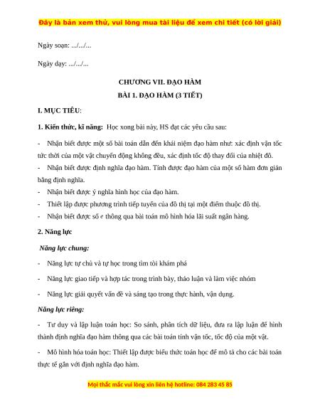 BÀI 1. ĐẠO HÀM (3 TIẾT) I. MỤC TIÊU: