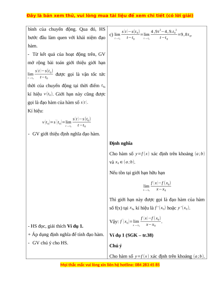 thành định nghĩa đạo hàm thông qua các bài toán tính vận tốc, tốc độ của một vật.