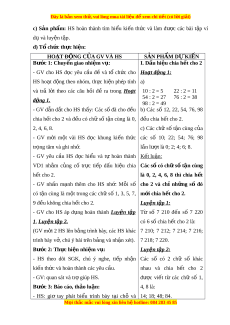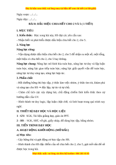 Ế CHO 2 VÀ 5 ( 1 TI T Ế ) I. M C Ụ TIÊU: 1. Ki n t ế h c ứ : H c ọ xong bài này, HS đ t ạ các yêu c u s ầ au: - Nh n ậ bi t ế và phát bi u đ ể ư c ợ d u hi ấ u chi ệ a h t ế cho 2, cho 5. 2. Năng l c ự Năng l c ự riêng: - V n d ậ ng ụ dư c d ợ ấu hi u chi ệ a h t ế cho 2, cho 5 để nh n r ậ a m t ộ s , m ố t ộ t ng, ổ m t ộ hiệu có chia h t ế cho 2, cho 5 hay không. Năng l c ự chung: Năng l c ự mô hình hóa toán h c, ọ năng l c ự t ư duy và l p ậ lu n ậ toán h c; ọ năng l c ự giao ti p ế toán h c; ọ năng l c ự gi i ả quy t ế v n ấ đề toán h c, ọ năng l c t ự duy s ư áng t o, năng ạ l c h ự p t ợ ác. 3. Ph m ẩ chất - Bồi dư ng ỡ h ng t ứ hú h c t ọ p, ậ ý th c l ứ àm vi c nhóm ệ , ý th c t ứ ìm tòi, khám phá và sáng t o cho H ạ S ⇒ đ c l ộ p, ậ t t ự in và t ch ự . ủ - Chăm chỉ tích c c ự xây d ng ự bài, chủ đ ng ộ chi m ế lĩnh ki n ế th c ứ theo sự hư ng d ớ ẫn c a G ủ V.
