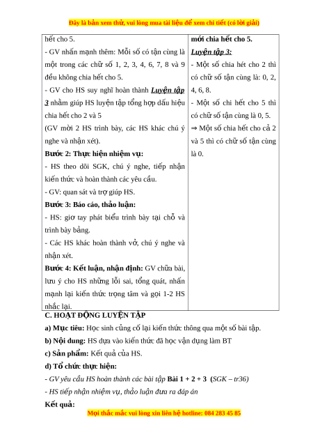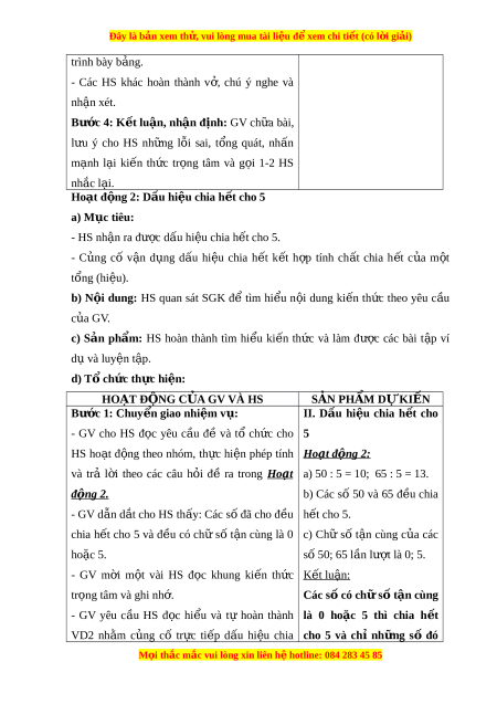 - Các HS khác hoàn thành v , ở chú ý nghe và nh n xét ậ . Bư c ớ 4: K t ế lu n, ậ nh n ậ đ nh: ị GV ch a ữ bài, l u ư ý cho HS nh ng ữ l i ỗ sai, t ng ổ quát, nh n ấ m nh ạ l i ạ ki n ế th c ứ tr ng ọ tâm và g i ọ 1-2 HS nh c l ắ i ạ . Hoạt đ ng 2: ộ D u hi ấ u chi ệ a h t ế cho 5 a) M c t ụ iêu: - HS nh n ậ ra đư c d ợ u hi ấ u chi ệ a h t ế cho 5. - C ng ủ cố v n ậ d ng ụ d u ấ hi u ệ chia h t ế k t ế h p ợ tính ch t ấ chia h t ế c a ủ m t ộ tổng (hi u ệ ). b) N i