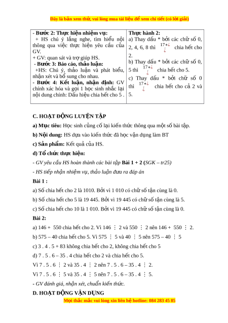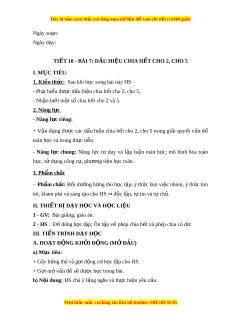 Đây là bản xem th , vu ử i lòng mua tài li u ệ đ xe ể m chi ti t ế (có l i ờ gi i ả ) Ngày so n: ạ Ngày d y: ạ TI T Ế 10 - BÀI 7: D U Ấ HI U Ệ CHIA H T Ế CHO 2, CHO 5 I. M C Ụ TIÊU: 1. Ki n t ế h c