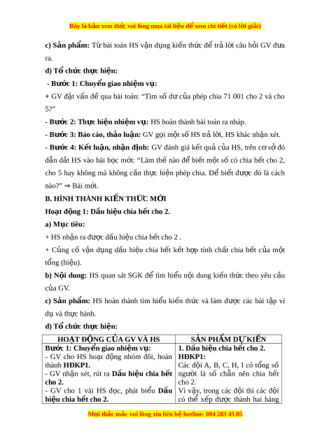 ứ : Sau khi h c ọ xong bài này HS - Phát bi u đ ể ư c ợ d u hi ấ u chi ệ a h t ế cho 2, cho 5. - Nh n ậ bi t ế m t ộ số chia h t ế cho 2 và 5. 2. Năng l c ự - Năng l c ri ự êng: + V n ậ d ng ụ đư c ợ các d u ấ hi u ệ chia h t ế cho 2, cho 5 trong gi i ả quy t ế v n ấ đề toán h c và t ọ rong th c t ự i n. ễ - Năng l c ự chung: Năng l c ự tư duy và l p ậ lu n ậ toán h c; ọ mô hình hóa toán h c, s ọ ử d ng công c ụ , ụ phư ng t ơ i n h ệ c t ọ oán. 3. Ph m ẩ chất - Phẩm ch t ấ : Bồi dư ng h ỡ ng t ứ hú h c ọ t p, ý t ậ h c l ứ àm vi c nhóm ệ , ý th c t ứ ìm
