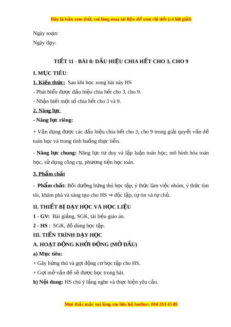 Đây là bản xem th , vu ử i lòng mua tài li u ệ đ xe ể m chi ti t ế (có l i ờ gi i ả ) Ngày so n: ạ Ngày d y: ạ TI T Ế 11 - BÀI 8: D U Ấ HI U Ệ CHIA H T Ế CHO 3, CHO 9 I. M C Ụ TIÊU: 1. Ki n t ế h c
