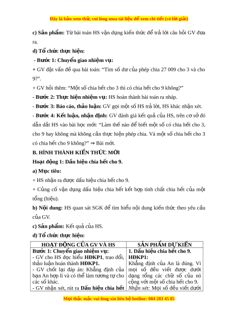 ứ : Sau khi h c ọ xong bài này HS - Phát bi u đ ể ư c ợ d u hi ấ u chi ệ a h t ế cho 3, cho 9. - Nh n ậ bi t ế m t ộ số chia h t ế cho 3 và 9. 2. Năng l c ự - Năng l c ri ự êng: + V n ậ d ng ụ đư c ợ các d u ấ hi u ệ chia h t ế cho 3, cho 9 trong gi i ả quy t ế v n ấ đề toán h c và t ọ rong tình hu ng t ố h c ự ti n. ễ - Năng l c ự chung: Năng l c ự tư duy và l p ậ lu n ậ toán h c; ọ mô hình hóa toán h c, s ọ ử d ng công c ụ , ụ phư ng t ơ i n h ệ c t ọ oán. 3. Ph m ẩ chất - Phẩm ch t ấ : Bồi dư ng h ỡ ng t ứ hú h c ọ t p, ý t ậ h c l ứ àm vi c nhóm ệ , ý th c t ứ ìm