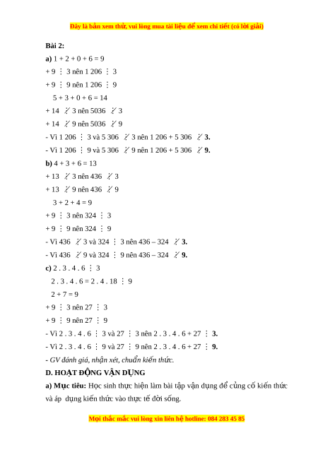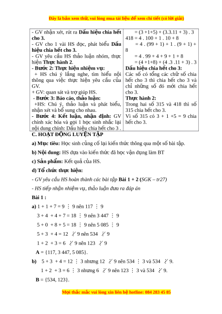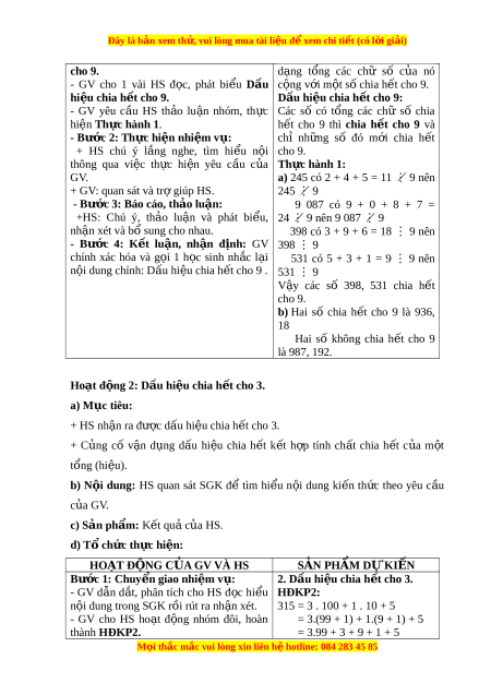 Đây là bản xem th , vu ử i lòng mua tài li u ệ đ xe ể m chi ti t ế (có l i ờ gi i ả ) cho 9. d ng ạ tổng các chữ số c a ủ nó - GV cho 1 vài HS đ c, ọ phát bi u ể Dấu c ng ộ v i ớ m t ộ số chia h t ế cho 9. hi u chi ệ a h t ế cho 9. Dấu hi u chi ệ a h t ế cho 9: - GV yêu c u ầ HS th o ả lu n ậ nhóm, th c ự Các số có t ng ổ các chữ số chia hiện Thực hành 1. h t ế cho 9 thì chia h t ế cho 9 và