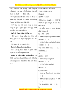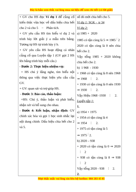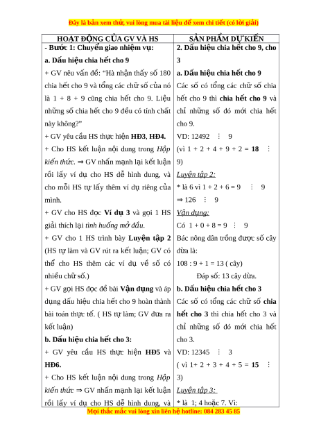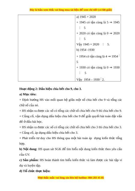 Đây là bản xem th , vu ử i lòng mua tài li u ệ đ xe ể m chi ti t ế (có l i ờ gi i ả ) a) 1945 + 2020 + 1945 có t n ậ cùng là 5 ⇒ 1945 ⋮ 5 + 2020 có t n ậ cùng là 0 ⇒ 2020 ⋮ 5 V y ậ 1945 + 2020 ⋮ 5. b) 1954 -1930 + 1954 có t n ậ cùng là 4 ⇒ 1954 5 + 1930 có t n ậ cùng là 0 ⇒ 1930 ⋮ 5 V y ậ 1954 – 1930 2. Hoạt đ ng 2: ộ D u hi ấ u chi ệ a h t ế cho 9, cho 3. a) M c t ụ iêu: + Định hư ng ớ HS vào m i ố quan hệ gi a ữ m t ộ số chia h t ế cho 9 và t ng ổ các ch s ữ ố c a ủ nó. + HS nh n r ậ a đư c các ợ s có t ố ng các ch ổ ữ s chi ố a h t ế cho 9 thì chia h t ế cho 9. + C ng ủ c , ố v n ậ d ng ụ d u ấ hi u ệ chia h t ế cho 9 đ ể gi i ả quy t ế bài toán đ t ặ v n ấ đ ề đ ở ầu bài h c. ọ + HS nh n r ậ a đư c các ợ s có t ố ng các ch ổ ữ s chi ố a h t ế cho 3 thì chia h t ế cho 3. + C ng c ủ ố, áp d ng d ụ u hi ấ u chi ệ a h t ế cho 3. + Phát tri n