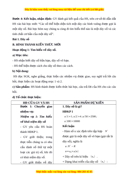 Đây là bản xem th , vu ử i lòng mua tài li u ệ đ xe ể m chi ti t ế (có l i ờ gi i ả ) Bư c ớ 4: K t ế lu n, ậ nh n ậ đ nh: ị GV đánh giá k t ế qu ả c a ủ HS, trên c ơ s ở đó d n ẫ d t ắ HS vào bài h c ọ m i ớ : “Các số th ể hi n ệ di n ệ tích m t ộ dãy các hình vuông đ c ượ g i ọ là m t ộ dãy s . ố Bài h c