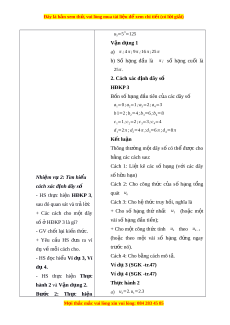 ứ , kĩ năng: H c ọ xong bài này, HS đ t ạ các yêu c u ầ sau: - Nh n ậ bi t ế dãy s ố h u ữ h n ạ , dãy s ố vô h n ạ . - Th ể hi n ệ cách cho dãy s ố b n ằ g li t ệ kê các s ố h n ạ g; b n ằ g công th c ứ t n ổ g quát; b n ằ g h ệ th c ứ truy h i ồ ; b n ằ g cách mô t . ả - Nh n ậ bi t ế tính ch t ấ tăng, gi m, ả b ịch n ặ c a ủ dãy s ố trong nh n ữ g tr n ườ g h p ợ đ n ơ gi n ả . 2. Năng l c ự Năng l c ự chung: - Năng l c ự t ự ch ủ và t ự h c ọ trong tìm tòi khám phá - Năng l c ự giao ti p ế và h p