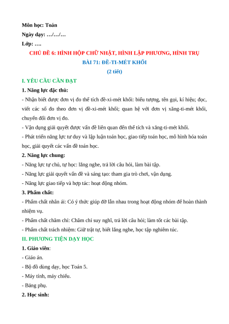 Giáo án Đề-xi-mét khối Toán lớp 5 Chân trời sáng tạo
