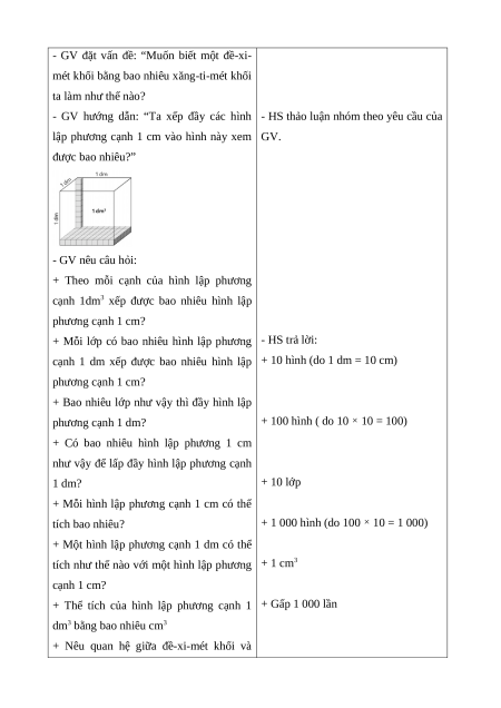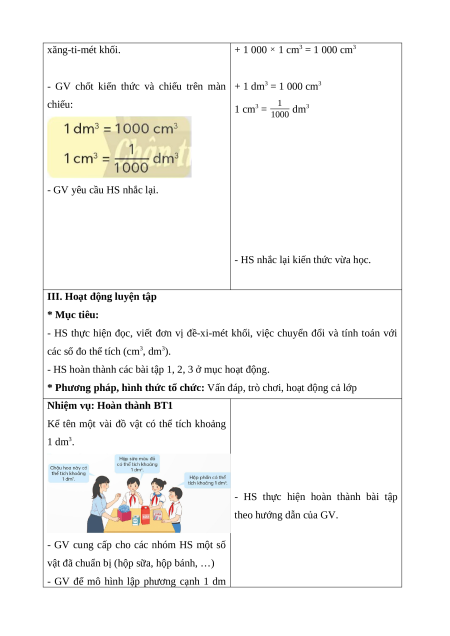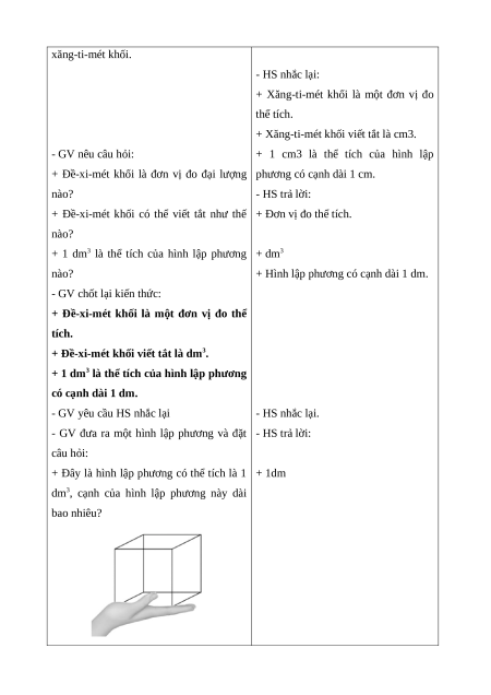 - Nhận biết được đơn vị đo thể tích đề-xi-mét khối. * Cách tiến hành: