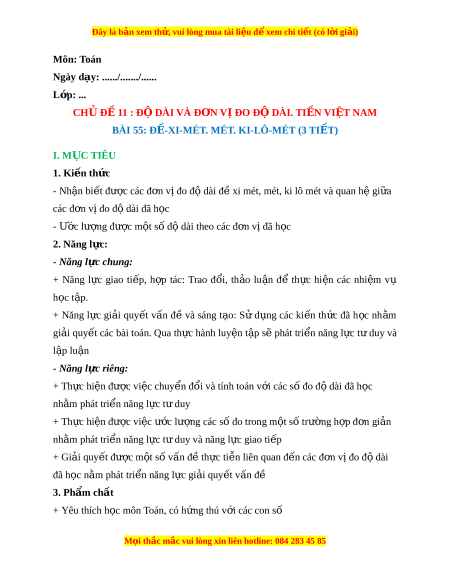 ế các bài toán. Qua th c hành l ự uy n t ệ p s ậ ẽ phát tri n năng l ể c ự t duy và ư l p ậ lu n ậ - Năng l c ự riêng: + Th c ự hi n đ ệ ư c ợ vi c chuy ệ n đ ể i ổ và tính toán v i ớ các số đo đ dài ộ đã h c ọ nh m ằ phát tri n năng ể l c t ự duy ư + Th c ự hi n đ ệ ư c ợ vi c ệ ư c l ớ ư ng ợ các s đo t ố rong m t ộ s t ố rư ng h ờ p đ ợ n ơ gi n ả nh m ằ phát tri n năng ể l c t ự duy và năng l ư c gi ự ao ti p ế + Gi i ả quy t ế đư c m ợ t ộ số v n đ ấ t ề h c ự ti n l ễ iên quan đ n các ế đ n v ơ đo đ ị dài ộ đã h c ọ n m ằ phát tri n năng l ể c gi ự i ả quy t ế v n đ ấ ề 3. Phẩm ch t ấ + Yêu thích h c m ọ ôn Toán, có h ng ứ thú v i ớ các con số M i