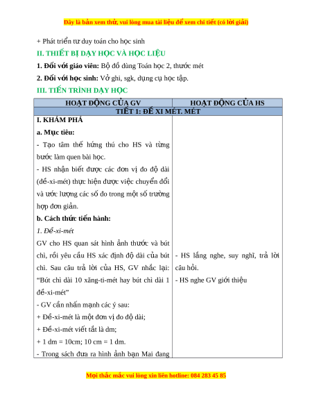 ớ giáo viên: Bộ đồ dùng Toán h c 2, t ọ hư c ớ mét 2. Đ i ố v i ớ h c s ọ inh: V ghi ở , sgk, d ng c ụ h ụ c t ọ p. ậ III. TI N Ế TRÌNH D Y Ạ H C Ọ HOẠT Đ N Ộ G C A Ủ GV HOẠT Đ N Ộ G C A Ủ HS TI T Ế 1: Đ X Ề I MÉT. MÉT I. KHÁM PHÁ a. Mục tiêu: - T o ạ tâm thế h ng ứ thú cho HS và t ng ừ bư c ớ làm quen bài h c. ọ - HS nh n ậ bi t ế đư c ợ các đ n ơ vị đo độ dài (đ - ề xi-mét) th c ự hi n ệ đư c ợ vi c ệ chuy n ể đ i ổ và ước lư ng ợ các số đo trong m t ộ s ố trư ng ờ h p ợ đ n gi ơ n. ả b. Cách th c ứ ti n hàn ế h: 1. Đ - ề xi-mét GV cho HS quan sát hình nh ả thư c ớ và bút chì, rồi yêu c u ầ HS xác đ nh ị độ dài c a ủ bút - HS l ng ắ nghe, suy nghĩ, trả l i ờ chì. Sau câu trả l i ờ c a ủ HS, GV nh c ắ l i ạ : câu h i ỏ .