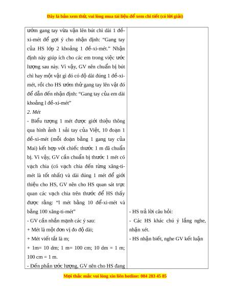 định này giúp ích cho các em trong vi c ệ ư c ớ lư ng ợ sau này. Vì v y ậ , GV nên chu n ẩ bị bút chì hay m t ộ v t ậ gì đó có đ dài ộ đúng 1 đ - ề xi- mét, r i ồ cho HS ư m ớ th ử gang tay lên v t ậ đó đ d ể ẫn đ n nh ế n ậ đ nh: ị “Gang tay c a ủ em dài kho ng ả l đ - ề xi-mét” 2. Mét - Bi u ể tư ng ợ 1 mét đư c ợ gi i ớ thi u ệ thông qua hình nh ả 1 s i ả tay c a ủ Vi t ệ , 10 đo n ạ 1 đ - ề xi-mét (m i ỗ đo n ạ b ng ằ 1 gang tay c a ủ Mai) k t ế h p ợ v i ớ chi c ế thư c ớ 1 m đã chu n ẩ bị. Vì v y ậ , GV c n ầ chu n ẩ bị thư c ớ 1 mét có v ch ạ chia (có v ch ạ chia đ n ế t ng ừ xăng-ti- mét là t t ố nh t