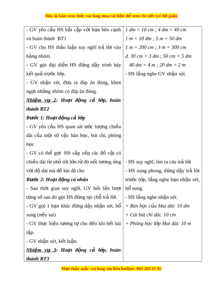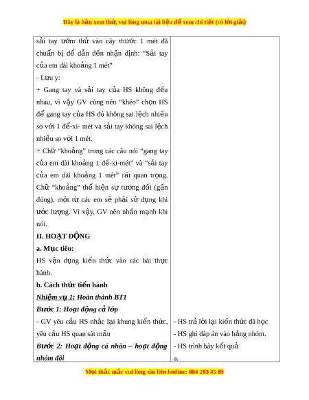 trong các câu nói “gang tay c a ủ em dài kho ng ả 1 đ - ề xi-mét” và “s i ả tay c a ủ em dài kho ng ả 1 mét” r t ấ quan tr ng. ọ Chữ “kho ng” ả thể hi n ệ sự tư ng ơ đ i ố (g n ầ đúng), m t ộ từ các em sẽ ph i ả sử d ng ụ khi ư c ớ lư ng. ợ Vì v y ậ , GV nên nh n ấ m nh ạ khi nói. II. HOẠT Đ N Ộ G a. Mục tiêu: HS v n ậ d ng ụ ki n ế th c ứ vào các bài th c ự hành. b. Cách th c ứ ti n hàn ế h Nhi m ệ v 1: